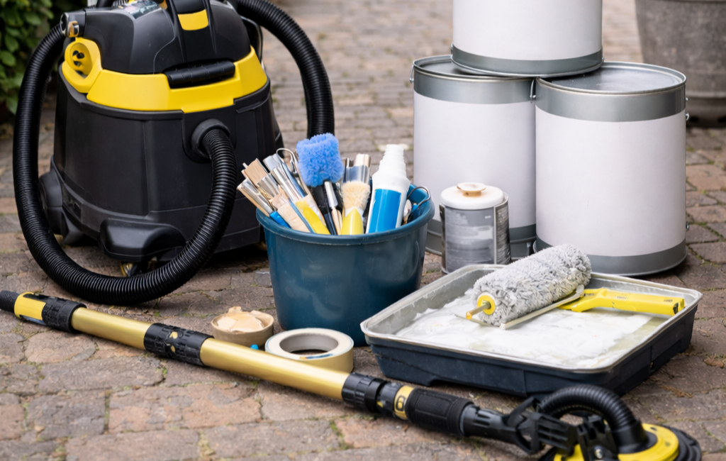 Je hoeft zelf niets uit te zoeken, niets verkeerd te kopen en geen materiaal aan te schaffen dat je maar één keer gebruikt. Ik voorzie professioneel materiaal zoals borstels, rollen, afplakmateriaal, ... correct afgestemd op jouw project. De huur van ladders, schuurmachines, stofafzuiging, ... is mogelijk.